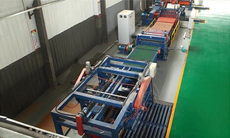 設(shè)備在工作時(shí)開卷機(jī)處于送料狀態(tài),板料進(jìn)入整平機(jī)校平后,再經(jīng)電眼控制活套、側(cè)向機(jī)構(gòu)進(jìn)入NC定尺裝置,NC定尺裝置按設(shè)定好的尺寸定尺向后工序剪床送料;當(dāng)NC送料達(dá)到設(shè)定尺寸時(shí),設(shè)備停止送料同時(shí)將信號(hào)傳給剪床,由剪床將板料切斷,切下的板料經(jīng)輸送裝置送入集料架整齊堆垛,堆垛鋼板的升降臺(tái)可隨堆垛鋼板高度的增加而自動(dòng)下降;當(dāng)堆垛鋼板張數(shù)達(dá)觸摸屏設(shè)定值時(shí),生產(chǎn)線自動(dòng)停機(jī),此時(shí)人工控制降下升降臺(tái),將出料臺(tái)車開出,同時(shí)開進(jìn)另一臺(tái)出料臺(tái)車,即進(jìn)入下一工作循環(huán)。