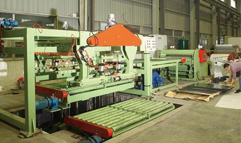 設(shè)備在工作時(shí)開卷機(jī)處于送料狀態(tài),板料進(jìn)入整平機(jī)校平后,再經(jīng)電眼控制活套、側(cè)向機(jī)構(gòu)進(jìn)入NC定尺裝置,NC定尺裝置按設(shè)定好的尺寸定尺向后工序剪床送料;當(dāng)NC送料達(dá)到設(shè)定尺寸時(shí),設(shè)備停止送料同時(shí)將信號(hào)傳給剪床,由剪床將板料切斷,切下的板料經(jīng)輸送裝置送入集料架整齊堆垛,堆垛鋼板的升降臺(tái)可隨堆垛鋼板高度的增加而自動(dòng)下降;當(dāng)堆垛鋼板張數(shù)達(dá)觸摸屏設(shè)定值時(shí),生產(chǎn)線自動(dòng)停機(jī),此時(shí)人工控制降下升降臺(tái),將出料臺(tái)車開出,同時(shí)開進(jìn)另一臺(tái)出料臺(tái)車,即進(jìn)入下一工作循環(huán)。
